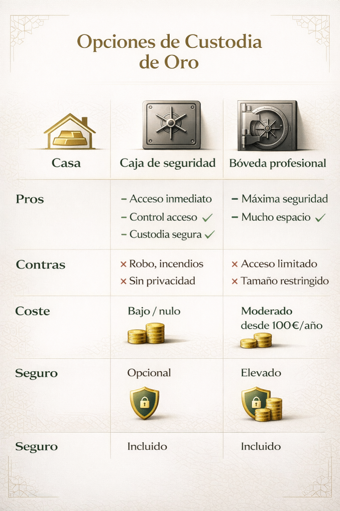 - Tres rutas clave en España: 1) Caja fuerte en casa (control total, pero exige seguridad/seguro); 2) Cajas de seguridad (banca o privadas) con póliza; 3) Bóvedas profesionales con custodia segregada y cobertura ampliable.
